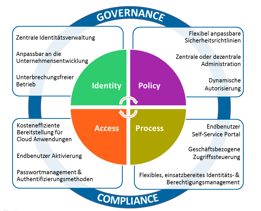 - einheitliches, übergreifendes Management von Identitäten und Zugriffsrechten, Partner und Kunden inbegriffen