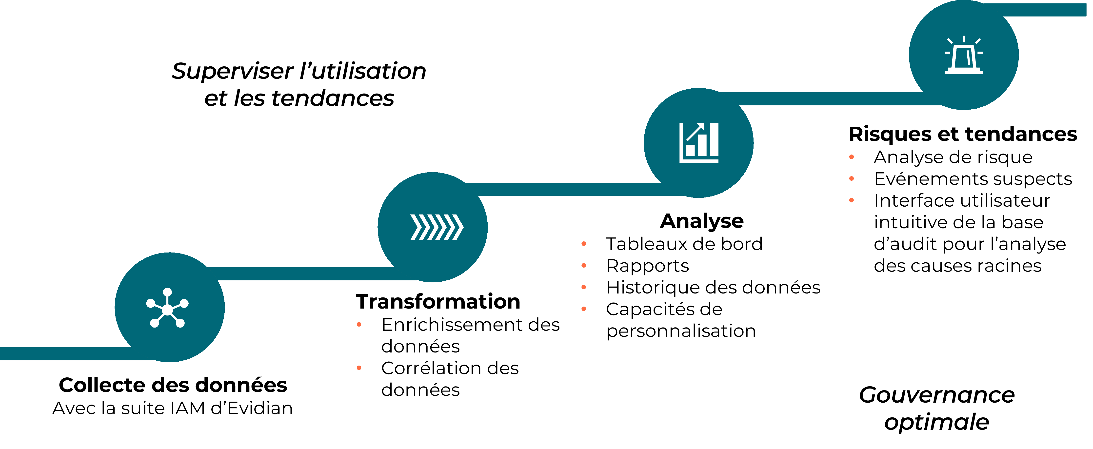 Evidian Analytics transforme les données brutes IAM en informations exploitables, conformément aux réglementations de conformité, aux politiques de sécurité et aux objectifs de gestion des risques de l'entreprise. Les professionnels de la sécurité peuvent désormais collecter, traiter et analyser les données d'accès et d'identité de leurs utilisateurs pour extraire les tendances, alerter et agir directement sur les menaces.