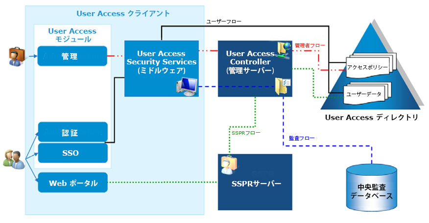 ユーザーの資格データ、管理設定データ等を保管する標準な LDAP ディレクトリ サーバーです。既存のActive Directoryを用いる場合はスキーマ拡張をして拡張領域にデータを保管します。 |