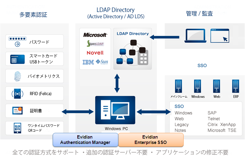 Evidian Enterprise SSO との組み合わせで、コンピュータのログオンを多因子認証デバイスを使いセキュリティを強化して、ログオンからアプリケーション認証、リモート クライアント認証または Citrix 仮想環境への認証も含めてすべてのアクセスを管理者が制御することができるようになります。