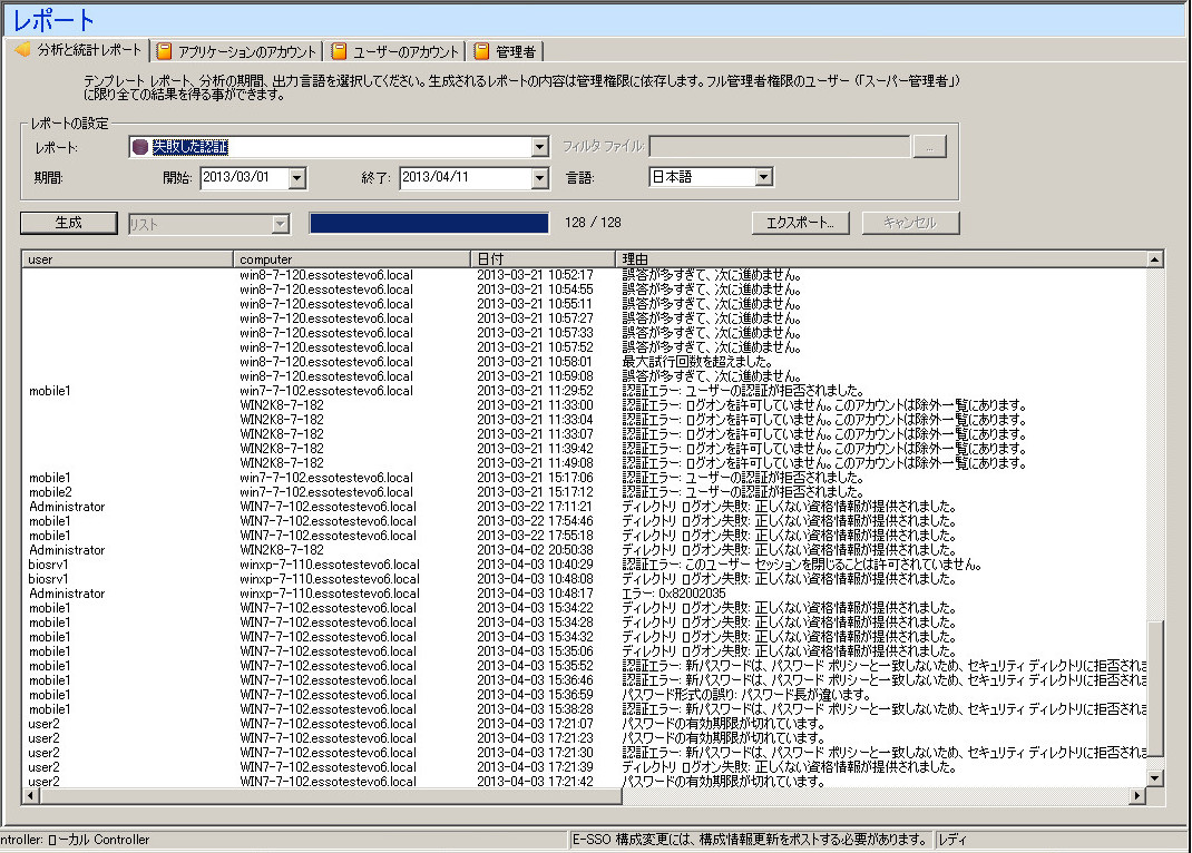 全ての認証監査イベントは監査データベースに蓄えられます。レポートは管理コンソールからユーザー毎、アクセスポイント毎、スマートカード毎等を表示できます。