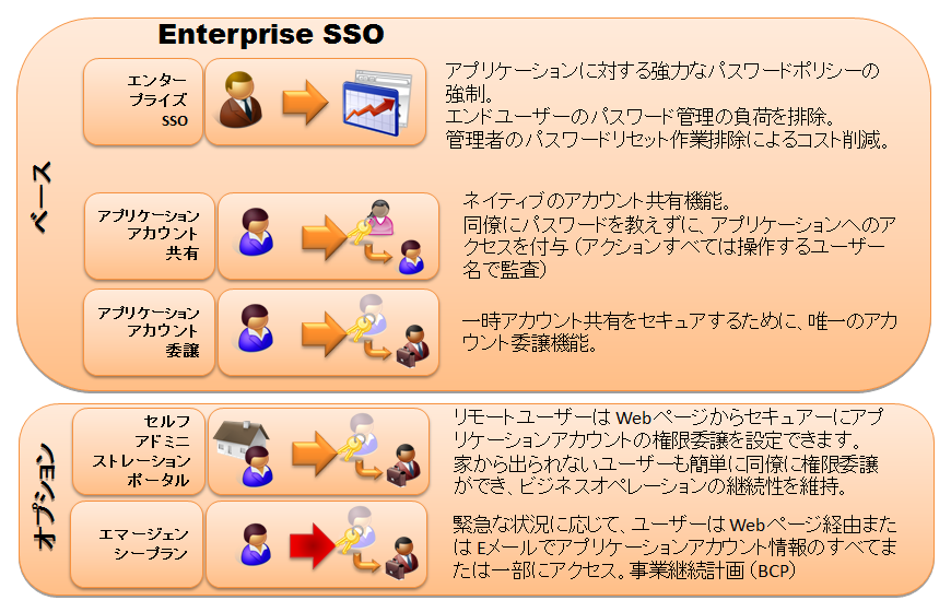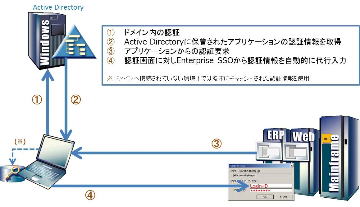 ユーザーは初回のログオンだけを意識すれば、後の認証はそれぞれのユーザーに応じたポリシーに基づいて自動的に実行されますので、全てのユーザーがパスワード管理にかかる煩わしさから開放され、社内全体の業務効率が飛躍的に上昇します。
