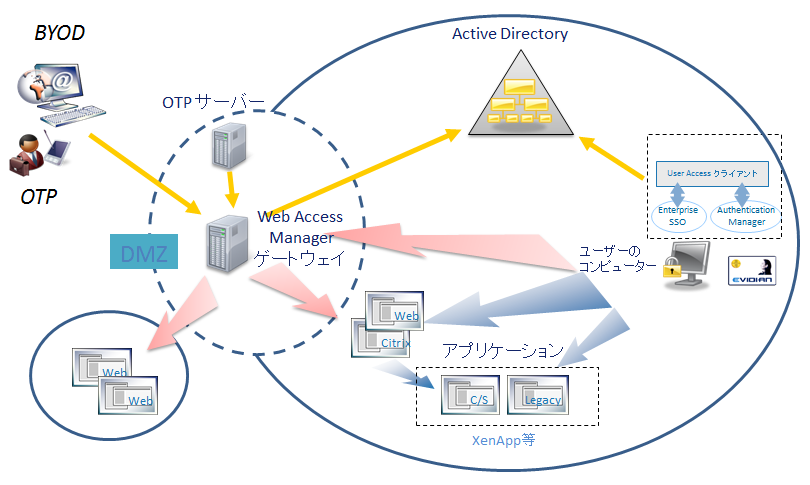 Evidian Web Access Manager とユーザー管理ディレクトリを共用することで、社内・社外からのアクセス管理と SSO を統合管理することが可能となり ます。