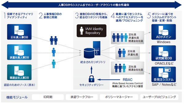今日の異機種混在環境に対して、統合されたアイデンティティ管理機能を提供する Evidian Identity Governance & Administration ( 旧製品名 : Identity & Access Manager ) には、人事データベースや派遣社員データベースなど、複数ソースの情報を統合し信頼できるアイデンティティ データベースを構築する ID 同期モジュール ID Synchronization 、ロールベースのアクセス管理などのセキュリティ管理モジュール Policy Manager 、ユーザー自身によるアクセス要求を可能とする承認ワークフロー モジュール Request Manager 、および、対象システム/アプリケーション上のユーザー アカウント情報をアップデートするユーザー プロビジョニング モジュール Builtin Connectors が含まれます。