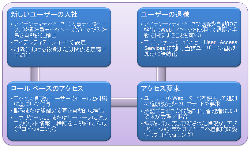 「 会社で誰が何にアクセスできるか?」、「退職したユーザーのアカウント全てが本当に無効になっているか?」、「部署を異動したユーザーが必要とするアクセス権をきちんと割り当てられているか?」、「新たな情報システムのアクセス規程、責務、トレーサビリティ、監査に関連する規程をいかに現在の情報システムに適応させるか?」 等は企業のセキュリティまたはアクセス制御の大きな課題です。