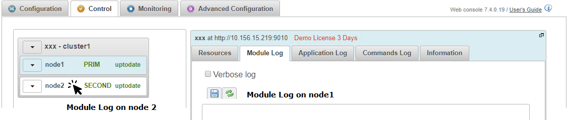 To see the progress of the copy, see the Module Log of node 2 with the verbose option without forgetting to refresh the window.