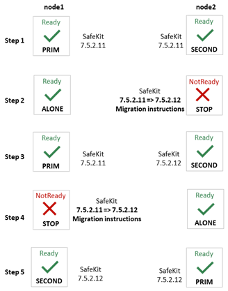 An upgrade is minor when the installed SafeKit package and the new one are compatibles in term of communications and internal components. Usually, only the last version number changes. For instance, upgrading from 7.5.2.11 to 7.5.2.12 is a minor upgrade. In this case, the order in which nodes are upgraded can be as described below.
