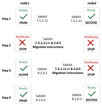 The upgrade procedure on the node itself may not be the standard one. Refer Migration instructions section in section 4 for details depending on your SafeKit release. Note that it is safe to apply this upgrade order also for minor upgrades.